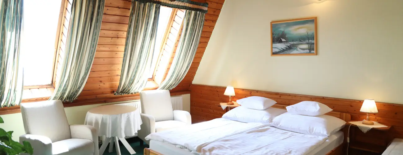 A szobák nagy méretűek, 2- 3 ágyasok, illetve tovább pótágyazhatóak, családok számára ideálisak. Néhány szoba fagerendás tornyos. Natúr fenyő bútorzat, minihűtő, sík képernyős tv, wifi, telefon, széf-fel felszereltek. Valamennyi szoba klimatizált, szép tágas fürdőszobával: tus/wc, kozmetikai pulttal, hajszárítóval ellátott.