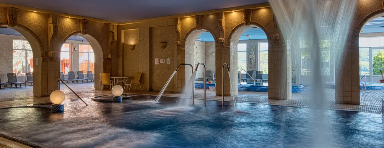 • Wellness részleg (beltéri medence, gőzkabin, sókabin, illatkamra, finn- és bioszauna, jacuzzi, élménymedence, melegvizes pihenőmedence, gyermekmedence, napozóágyak)